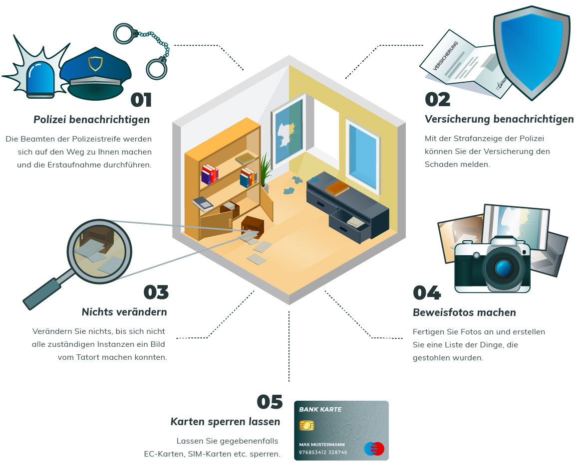 Nachdem in den eigenen vier Wänden eingebrochen worden ist, sitzt der Schock tief in den Knochen. Natürlich solltet ihr euch erst einmal von eurem Schrecken erholen. Gleichzeitig ist es aber auch wichtig, dass ihr jetzt aktiv werdet. Die folgende Infografik gibt euch einen Überblick über das richtige Verhalten nach einem Einbruch.
